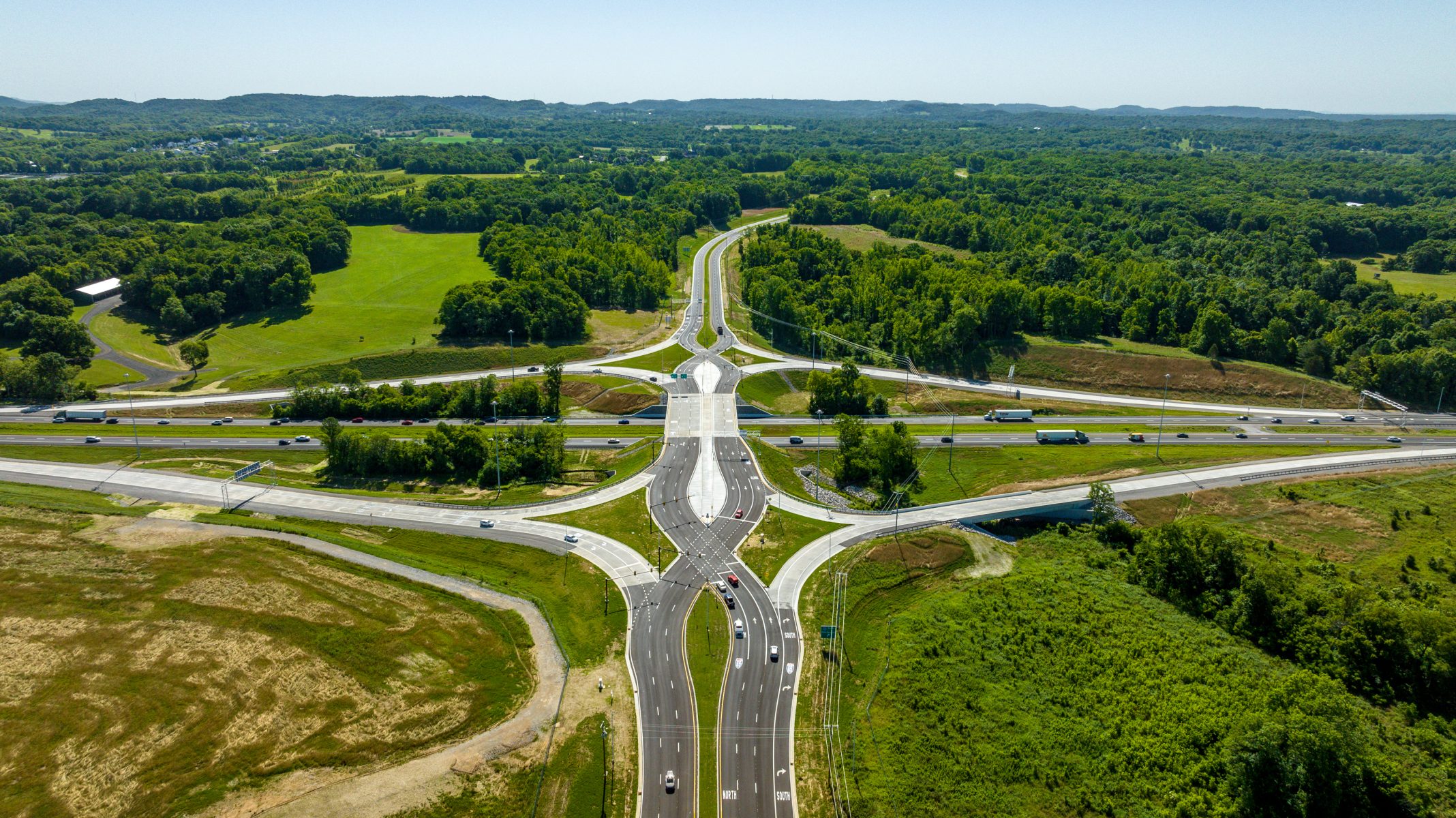 BELL Construction served as the Design-Builder for this state-of-the-art diverging diamond interchange located on I-65 ten miles south of the Murfreesboro Road/Franklin exit. The project also included the construction of the 2.25-mile extension of Buckner Road from Buckner Lane to Lewisburg Pike, now named June Lake Boulevard. The project included roadway extensions, interstate resurfacing, two bridges, drainage structures, new signals and lighting, pavement markings and signage, and environmental permitting and compliance.